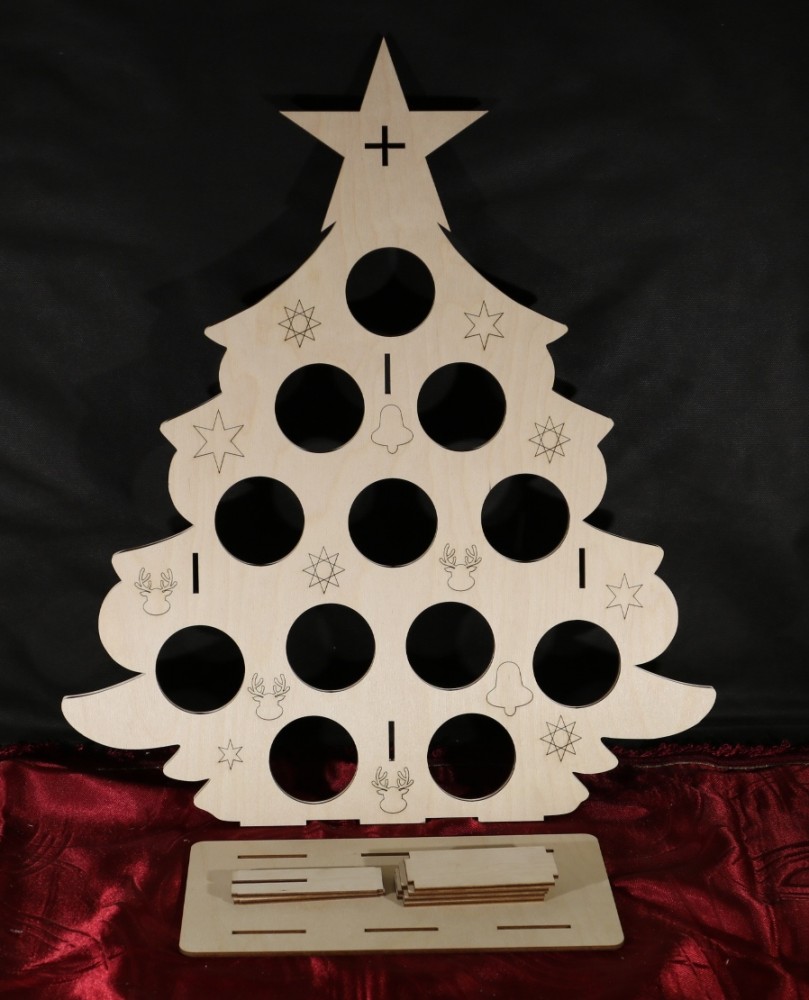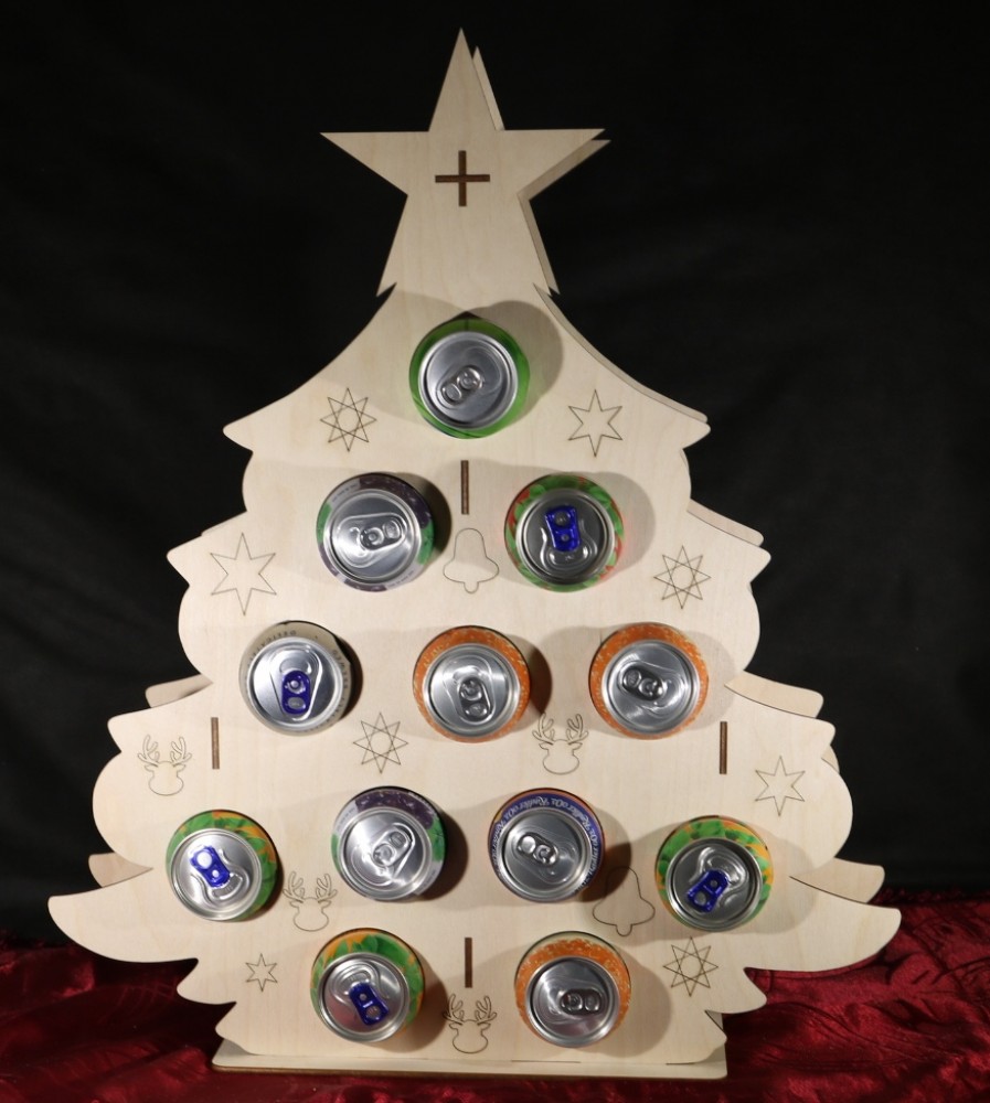 0,5l dobozos sörhöz, vagy azzal megegyező formájú és méretű termékekhez. Maximum 6 kg terhelést bír el. Tartalmazza a két fenyőfa alakú lapot, a két darab talp merevítőt, a 4 db távtartót, és a felső fogantyú elemet. A képeken látható sörök nem képezik a termék részét! Ezeket nem szállítjuk a termékkel együtt. Anyaga 4mm vastag nyírfa rétegelt lemez. 59cm magas, a sörös dobozoknak kialakított lyukak pedig 67mm átmérőjűek. Összeállítás: Az összeállításhoz szüksége lesz egy kis mennyiségű faragasztóra, amit mellékelünk a termékhez. Ennek segítségével néhány perc alatt össze tudja állítani a fát. Szállítás kizárólag lapra szerelten.
