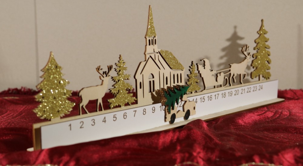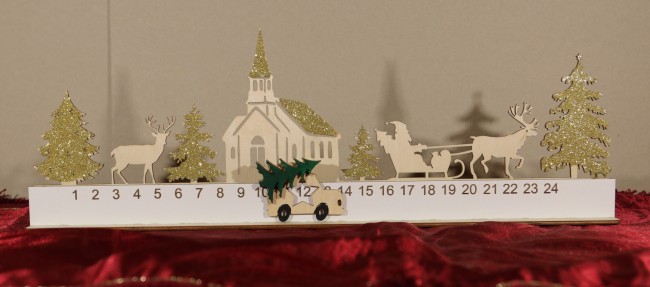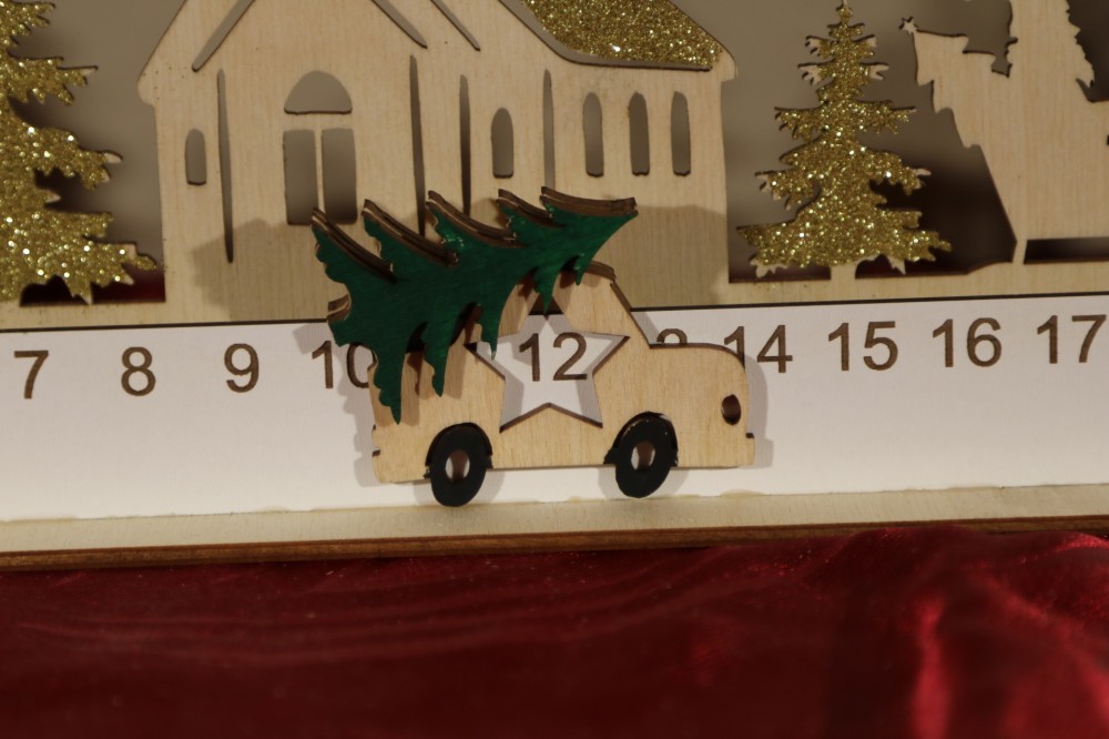 Asztali adventi naptár, egyedi kézzel festett kisautóval, aminek a segítségével a gyerekek beállíthatják a megfelelő dátumra.