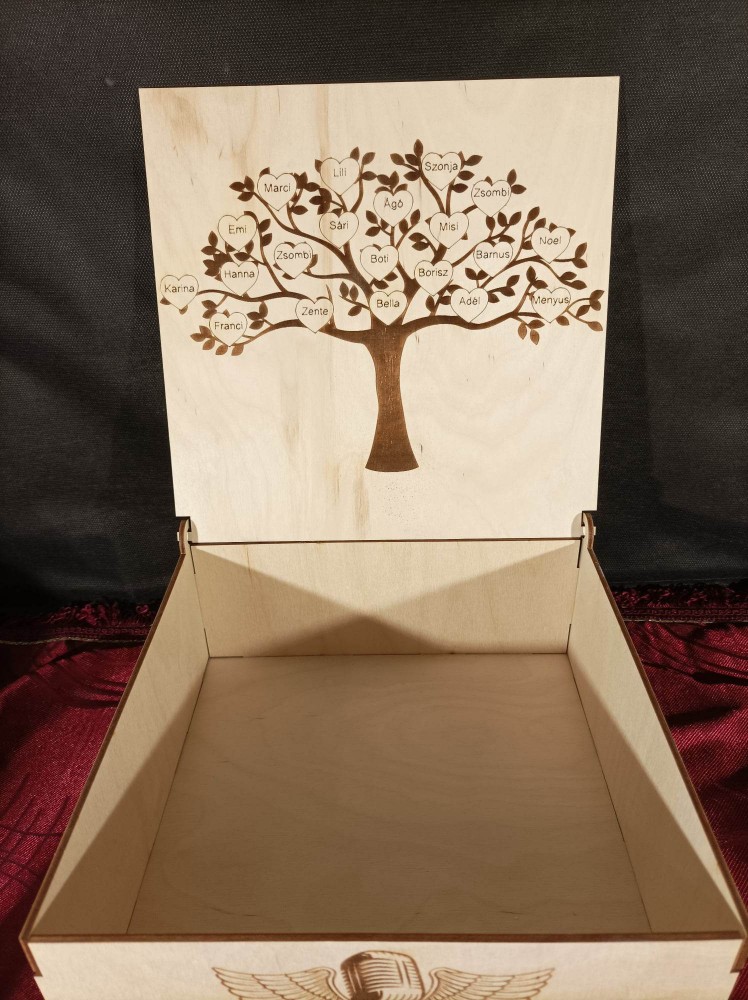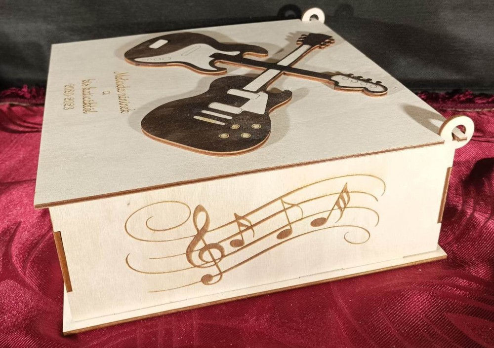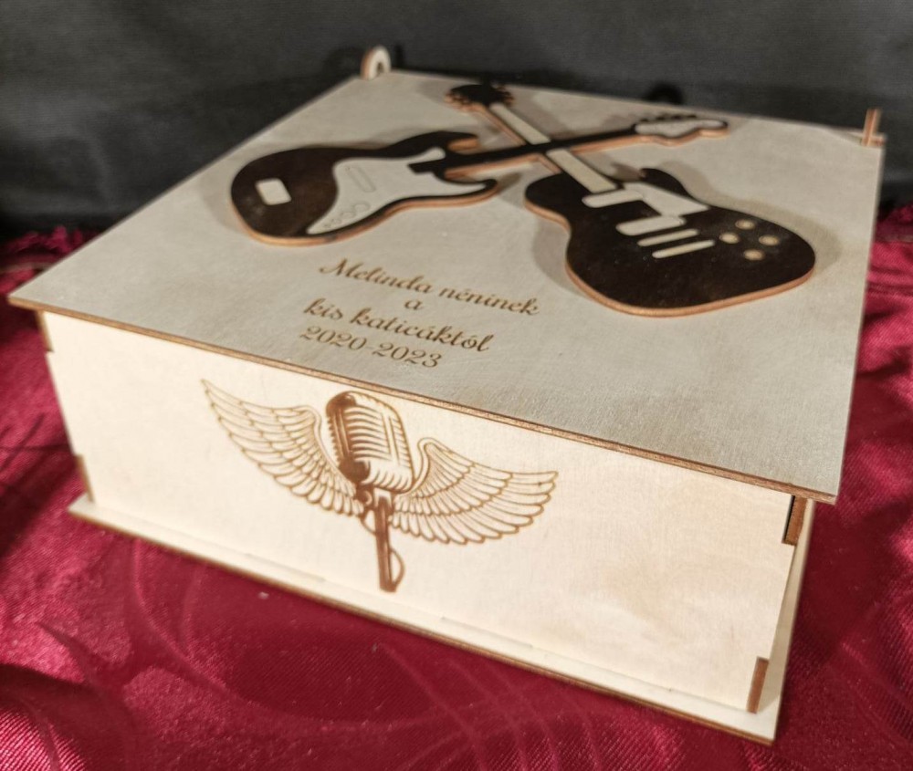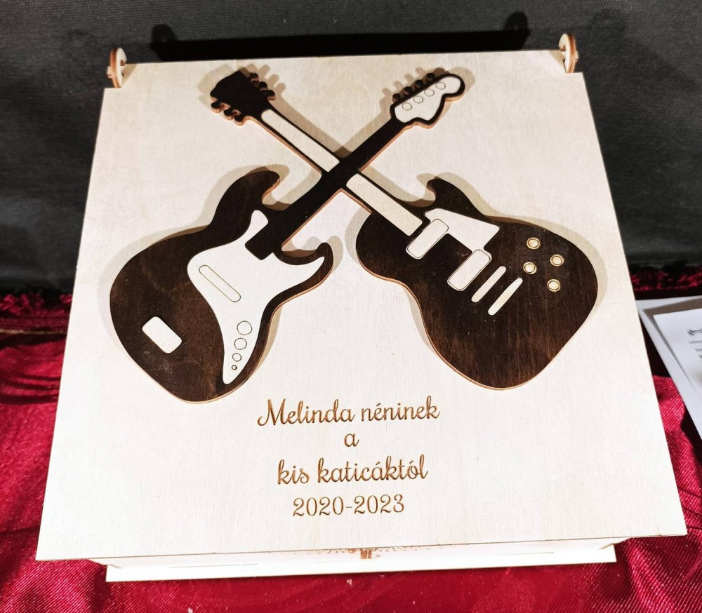 Felnyíló tetős emlékdoboz, melynek tetejére sötét barnára pácolt gitár van ragasztva, oldalai pedig zenei motívumokkal díszítettek. A tető belső oldalán gravírozott életfa található, melyen szívecskékben a gyerekek nevei láthatók. Egyedi, személyre szóló ajándék, melynek szövegét kérés szerint átírjuk. Kérem, a kívánt feliratot, valamint az életfára kerülő neveket a megjegyzés mezőben tüntesse fel, vagy keressen minket emailben a részletek megbeszélése céljából.