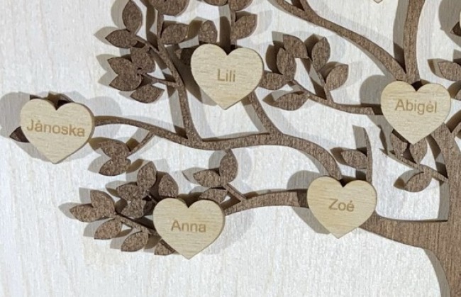 Életfához rendelhető gravírozott szívek. A szükséges mennyiséget helyezze a kosárba, és a megjegyzés mezőben adja meg a gyerekek keresztnevét, amik a szívekre fognak kerülni. Ezeket a szíveket, a megrendelt életfára ráragasztva fogjuk eljuttatni önnek.