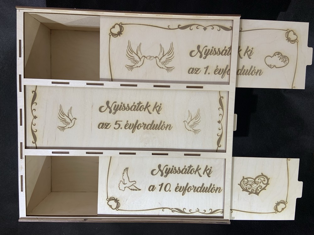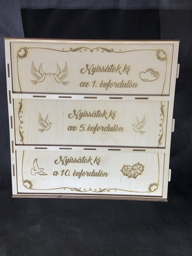 Kitűnő ajándék esküvőre az ifjú párnak. Három külön nyitható rekesszel ellátott boros doboz, amibe bort, vagy egyéb ,más ajándék is elhelyezhető.