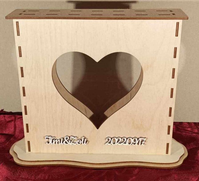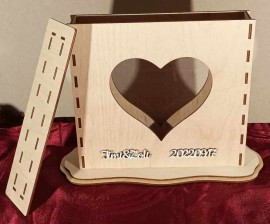 Ez a doboz örök emléke a szertartáson lévő homokceremóniának. A dobozra a neveket és a dátumot natúr színben vagy fehérre, illetve világos rózsaszínre festve kérheti. A doboz mindkét oldalán szív alakú nyílás van melyre belülről üveget ragasztunk, hogy a belekerülő homok ne szóródjon ki. A doboz teteje levehető, ezen keresztül tudják a homokot beleönteni. A dobozba maximálisan 2 liter homok fér el.