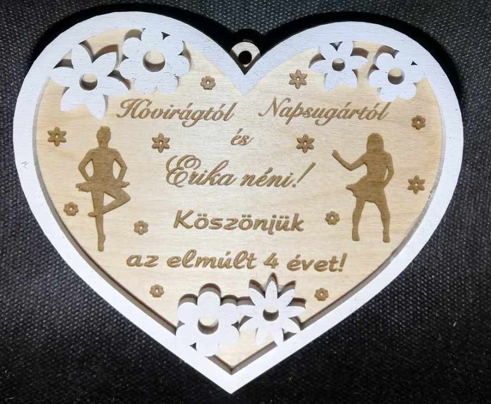 A szív két rétegből áll, az alsó rétegre Tanároknak szóló pár szavas köszönőszöveg van gravírozva, a felső réteg pedig kivágott virágmintás. A felső réteget halvány rózsaszín színűre vagy fehérre festve ragasztjuk rá. A szöveg igény esetén megváltoztatható és a képen látható táncos alak elhagyható. A kért pár szavas szöveget, illetve a táncos alak elhagyását kérem, a megjegyzés mezőben adja meg, vagy emailben vegye fel velünk a kapcsolatot egyeztetés céljából!