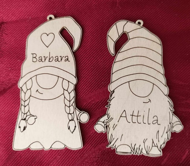 Egyedi, névre gravírozott törpe karácsonyfa dísz. A kért neveket a megjegyzés mezőben tudja megadni.