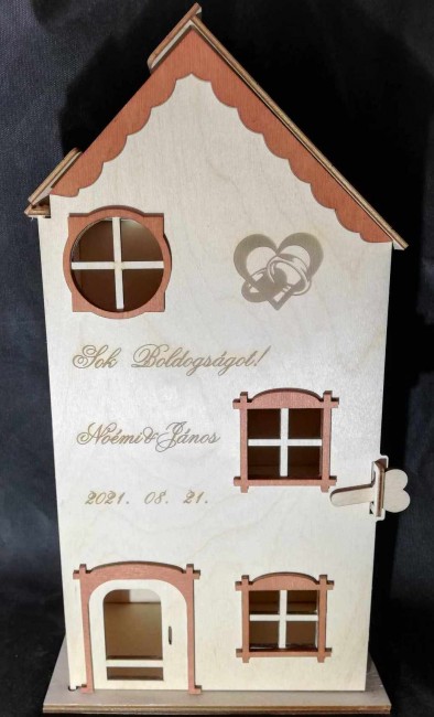 Kiváló nászajándék esküvőre vagy házassági évfordulóra. Egy üveg pálinka és kettő darab röviditalos pohár fér el benne. A házikó elejére rágravírozható az ifjú pár neve, a házasságkötés dátuma, vagy a házassági évforduló száma és egy jókívánság. A neveket, dátumot és a jókívánság szövegét a megjegyzés mezőbe adja meg!