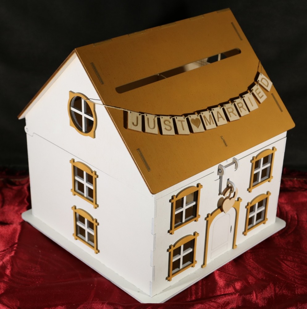A házikó teteje felnyitható, és lakattal lezárható. A tetejére kérhető az ifjú pár neve és a házasságkötés dátuma, vagy a mellékelt képen látható zsinórra felfűzött Just Married felírat.