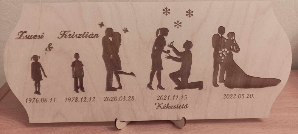 Szép ajándék az ifjú párnak ez a tábla, melyen megismerkedésük története látható. A táblán a nevük, születésük dátuma, valamint találkozásuk, a lánykérés és az esküvőjük dátuma van gravírozva.