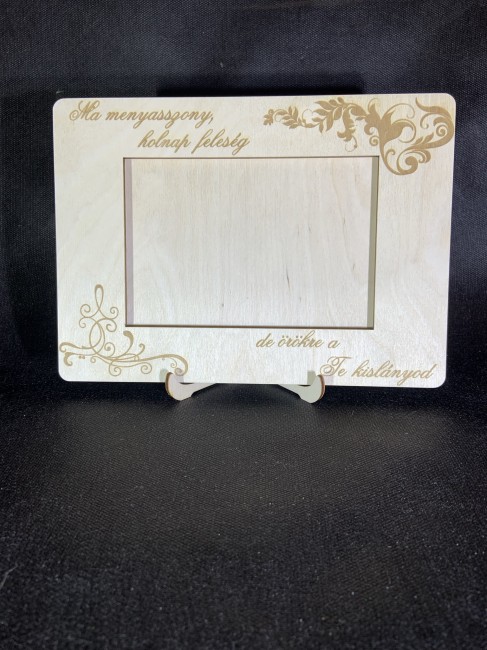 Remek ajándék esküvő alkalmából az örömszülők részére. A képkeret üveget nem tartalmaz. Ajándék asztali tartóval együtt szállítjuk, amely egyaránt lehetővé teszi a fektetett, vagy állított elhelyezését a képkeretnek.