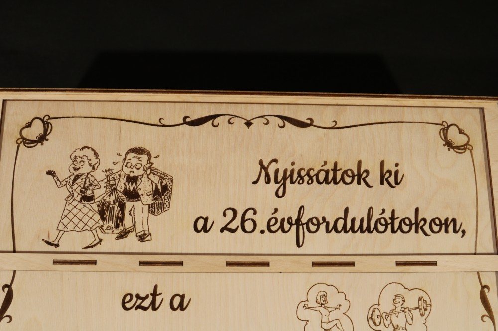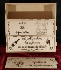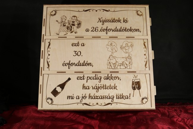 Kitűnő ajándék esküvőre az ifjú párnak. Három külön nyitható rekesszel ellátott boros doboz, amibe bort, vagy egyéb ,más ajándék is elhelyezhető.