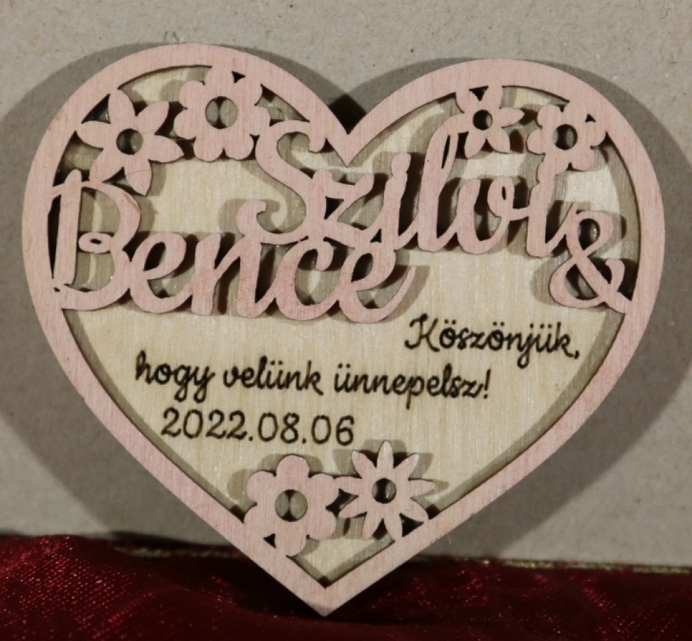 Esküvői hűtőmágnes, amely egyben köszönetajándék is a násznépnek. A hűtőmágnes két rétegből áll, a felső virágos réteg tartalmazza az ifjú pár keresztneveit, az alsó réteg pedig a házasságkötés dátumát és egy rövid köszönő üzenetet. A hűtőmágnesre kerülő neveket, dátumot és szöveget a megjegyzés mezőben tüntesse fel!